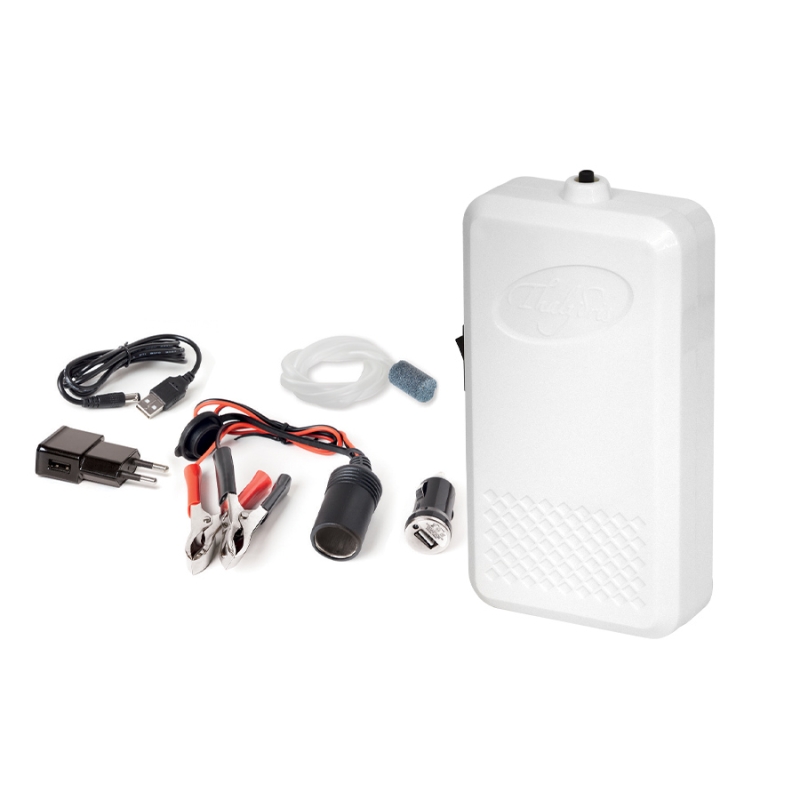Αντλία οξυγόνου με δύο ταχύτητες και με τέσσερις διαφορετικές πηγές ενέργειας! Δεν χρειάζεται πλέον η χρήση διαφορετικού οξυγονωτή για το σπίτι και το αυτοκίνητο ή το σκάφος, αφού αυτή η αντλία μπορεί να χρησιμοποιηθεί οπουδήποτε: στο σπίτι συνδέεται σε πρίζα 220V με USB, στο αυτοκίνητο συνδέεται με 12V βύσμα USB, στο σκάφος συνδέεται με τη μπαταρία και όταν χρησιμοποιείται μακριά από πηγές ρεύματος λειτουργεί με 3 μπαταρίες AA (δεν περιλαμβάνονται). Στη συσκευασία συμπεριλαμβάνονται η πρίζα 220V με USB, o αντάπτορας 12V USB και το καλώδιο για τους πόλους της μπαταρίας του σκάφους.