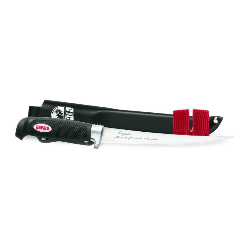 Μαχαίρι φιλεταρίσματος με τη δημοφιλή εύκαμπτη λεπίδα της Rapala από ανοξείδωτο ατσάλι, αντιολισθητική, μαλακή λαβή και μεγαλύτερο προστατευτικό δακτύλου για περισσότερη ασφάλεια. Διατίθεται με δερμάτινη μαύρη θήκη που μπαίνει στη ζώνη και με ακονιστή.