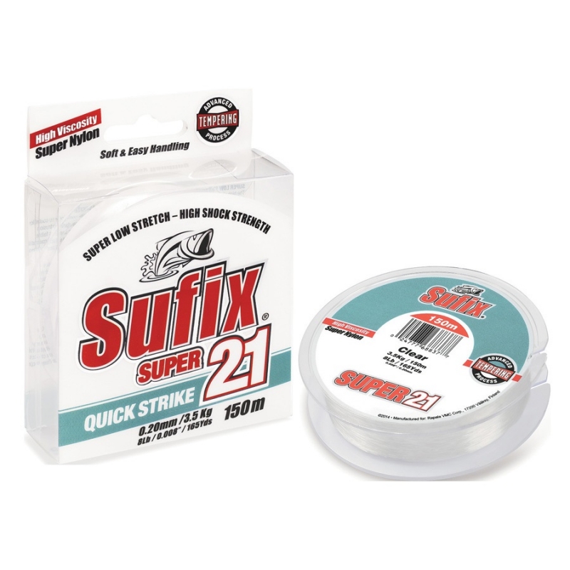 Η νέα πετονιά SUFIX SUPER 21 είναι φτιαγμένη από νάιλον υψηλής πυκνότητας, με τη χρήση μιας προηγμένης διαδικασίας βαφής, που δίνει σαν αποτέλεσμα μόνο 21% ελαστικότητα, σχεδόν τη μισή από τις κοινές πετονιές. Συνδυάζοντας αυτή τη μικρή ελαστικότητα με τη μεγάλη αντοχή έχουμε τον απόλυτο έλεγχο των δολωμάτων, τα πιο γρήγορα καρφώματα και το μέγιστο της παραβολικότητας των καλαμιών.